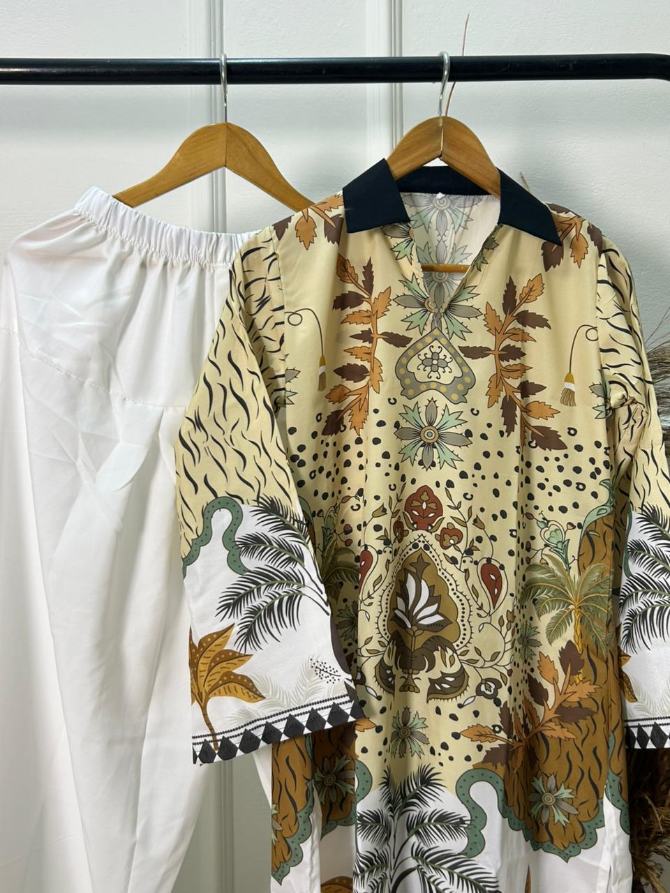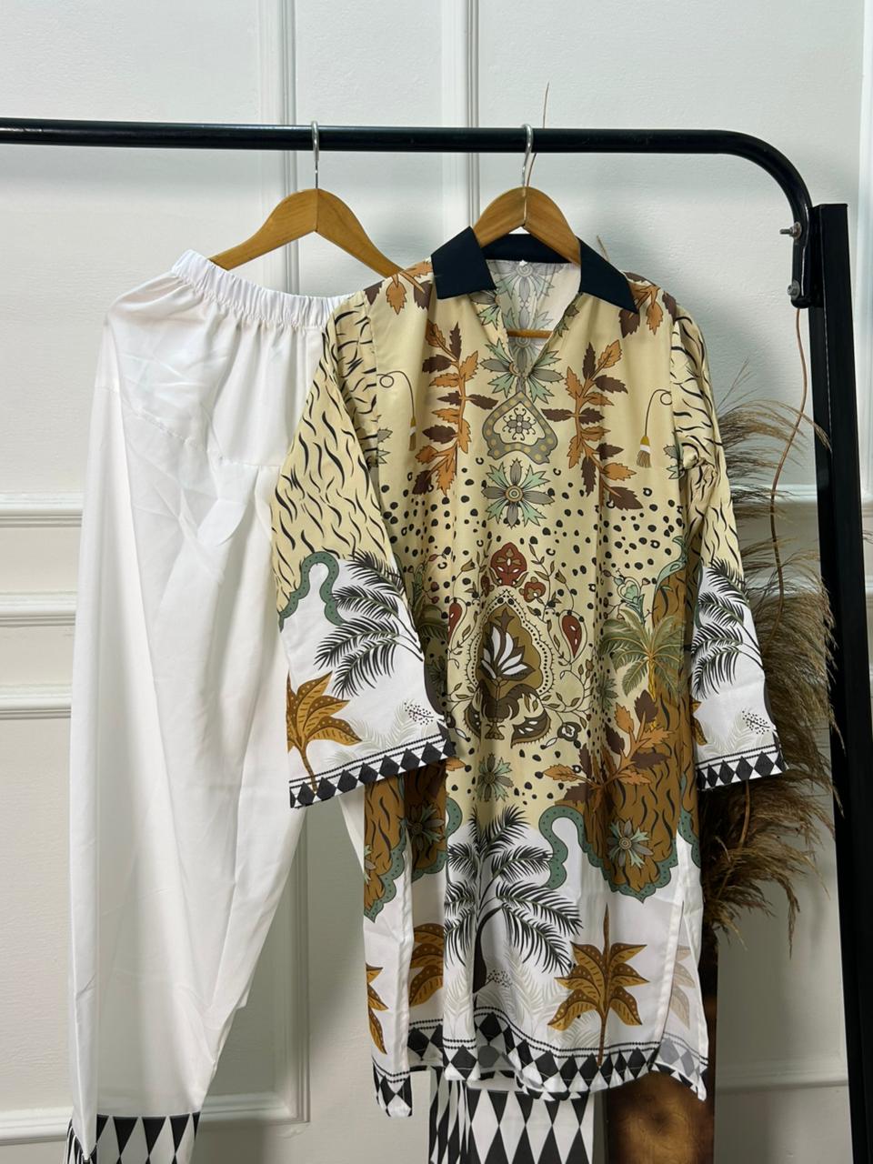 This Desert Delight 2 piece tunic combines comfort and style, featuring intricate floral and palm tree motifs. The fabric is soft and luxurious, offering a smooth, lightweight feel that ensures comfort while keeping you stylish. Perfect for both casual and semi-formal occasions, this tunic is designed to elevate your wardrobe.