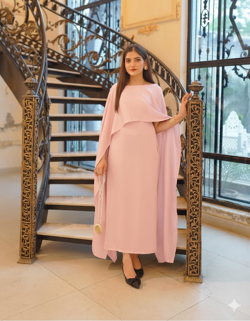Draped in pure elegance, this flowing silk gown in a BABYPINK exudes timeless sophistication. Designed with a cape-style overlay, it creates a graceful silhouette that moves effortlessly with every step. The fluid texture of silk enhances its luxurious appeal, while the minimalist cut keeps it modern and chic. Paired with delicate accessories, this ensemble is perfect for evening soirées, formal gatherings, or any occasion where effortless glamour is desired.