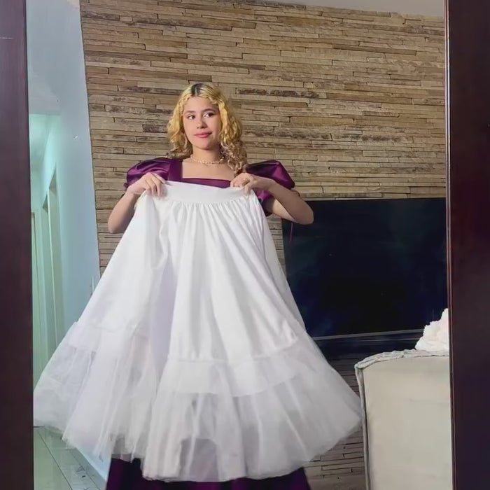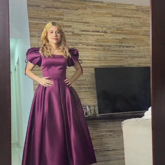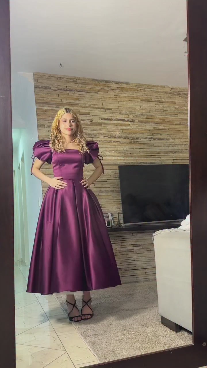 This exquisite tea-length dress is crafted from luxurious, high-quality deep plum (or eggplant) satin silk, giving it a rich sheen and a truly royal presence. Perfect for a grand party, a special event, or even a unique prom look, this dress guarantees you'll feel like royalty.