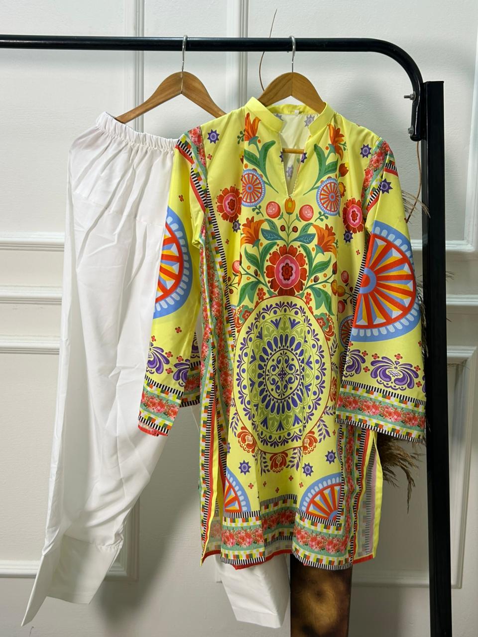 Rangila Andaaz is a graceful 2-piece long outfit crafted from premium quality silk crepe fabric, designed for effortless elegance and comfort. The beautifully printed long shirt features a flattering straight silhouette, paired with a coordinated trouser for a refined, modest look. Soft, breathable, and flowy, this outfit drapes perfectly for both casual and semi-formal wear.