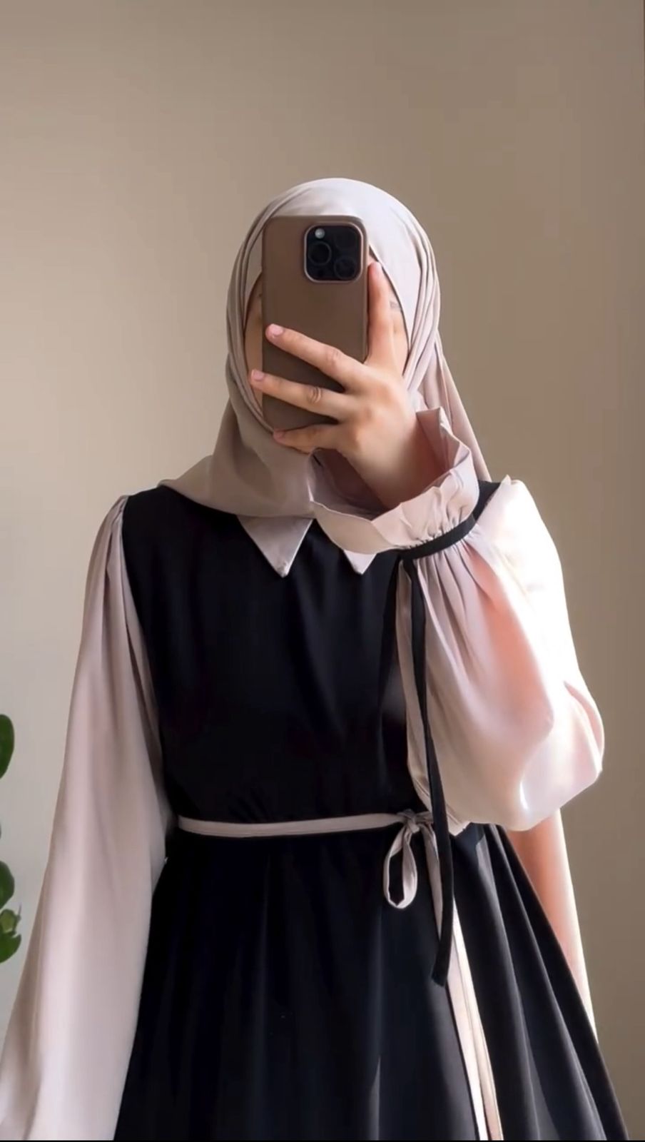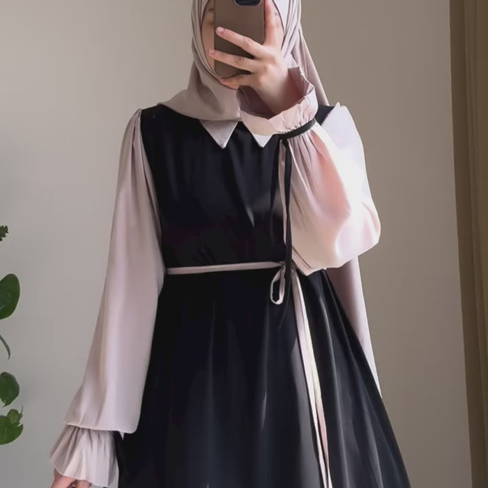 This abaya features a sophisticated two-tone design that mimics the look of a structured bodice paired with ethereal, flowing sleeves. The cinched waist creates a flattering, tailored fit, while the ruffled, elasticized cuffs add a touch of romantic flair.